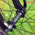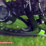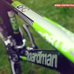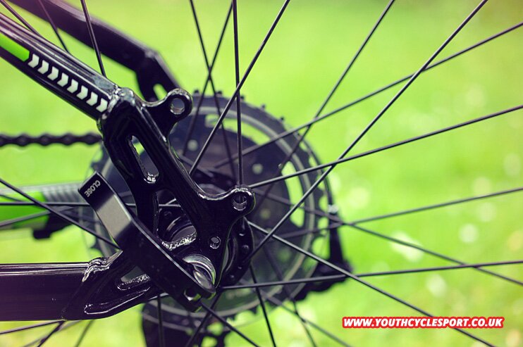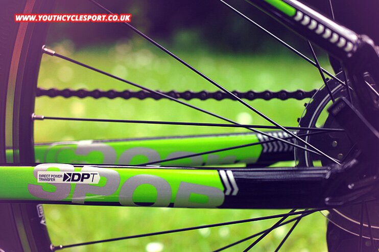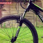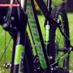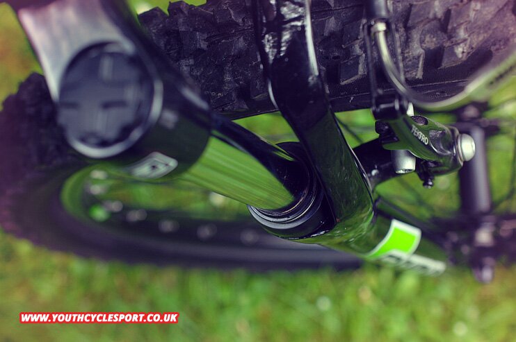 The MTB’s glossy black aluminium frame shows off the trademark Boardman smooth welds beautifully. And with its bright green and white contrasts it looks just like Boardman’s adult Team 650b MTB frame – very smart!