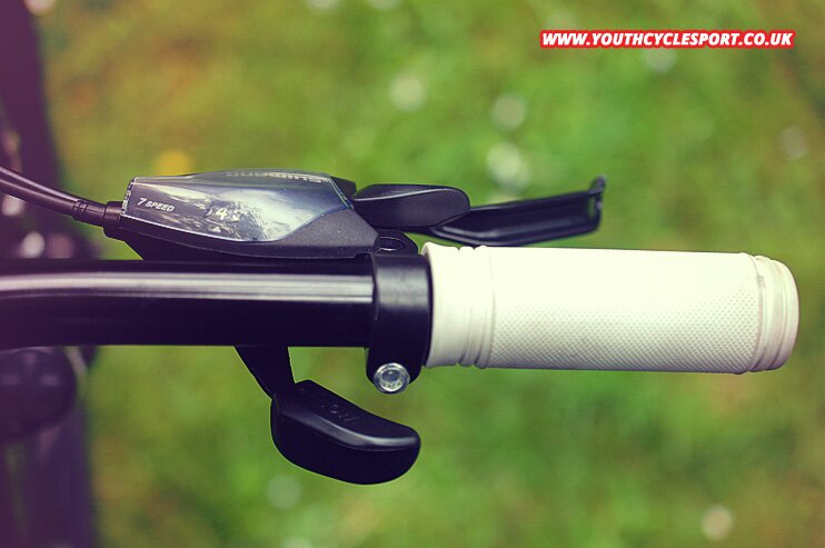 Shimano Altus trigger shifters handle the gear changing. We already know them as positive units with the advantage of a clear gear indicator that children like. They change gear easily too. Just as with the Boardman junior hybrid, our testers sometimes had the irritation of their knees hitting the Altus pods & triggers when climbing out of the saddle.
